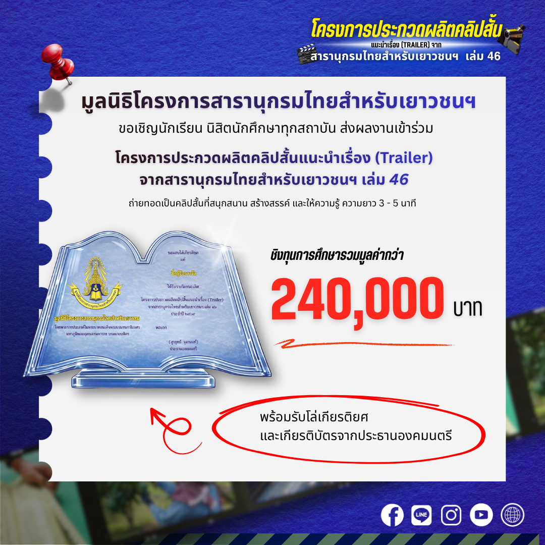 ขอเชิญชวน นักเรียน นิสิตนักศึกษาทุกสถาบัน ส่งผลงานเข้าร่วมโครงการประกวดผลิตคลิปสั้นแนะนำเรื่อง (Trailer) จากสารานุกรมไทยสำหรับเยาวชนฯ เล่ม 46 🎬ถ่ายทอดเป็นคลิปสั้นที่สนุกสนาน สร้างสรรค์ และให้ความรู้ ความยาว 3 - 5 นาที เพื่อชิงทุนการศึกษามูลค่ากว่า 240,000 บาท ✨✨ พร้อมรับโล่เกียรติยศและเกียรติบัตรจากประธานองคมนตรี