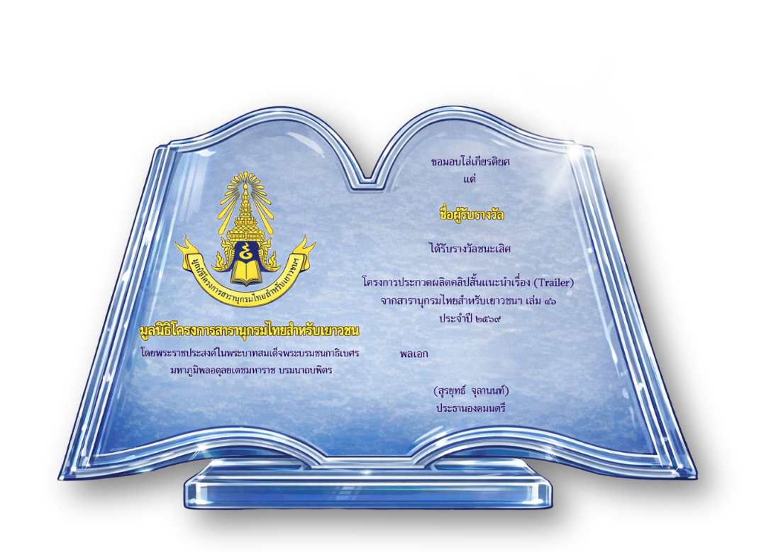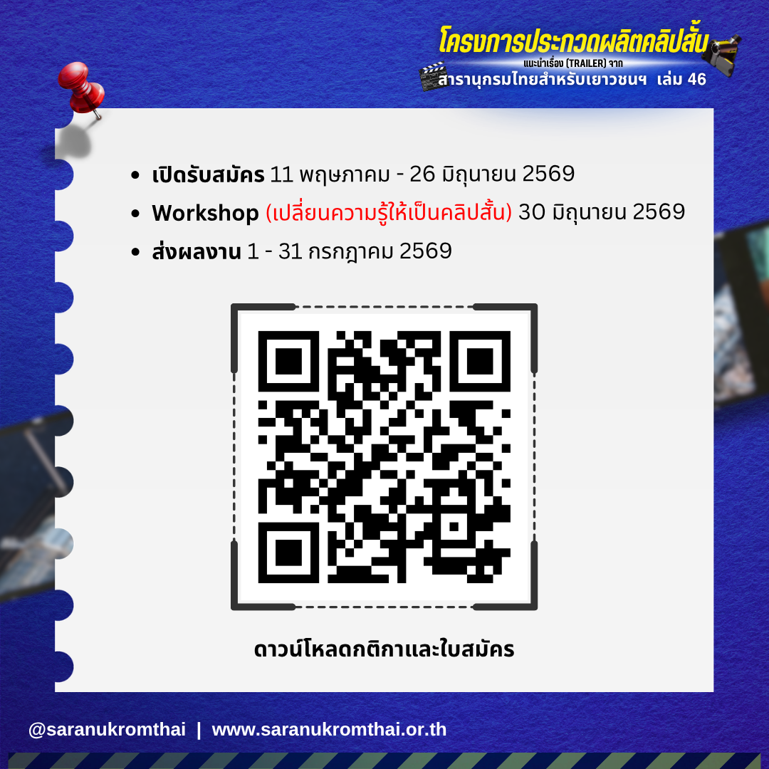 - ลงทะเบียนเข้าร่วม “โครงการประกวดผลิตคลิปสั้นแนะนำเรื่อง (Trailer) จากสารานุกรมไทยสำหรับเยาวชนฯ เล่ม 46”